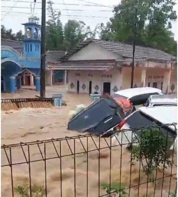 Sejumlah mobil dilaporkan terbawa hanyut akibat banjir luapan Sungai Cikaso di Kampung Parungseah, Desa Curugluhur, Kecamatan Sagaranten, Sukabumi, Jawa Barat, pada Rabu (4/12/2024).